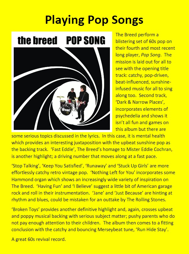 “Pop Song” is the Fourth album from the Breed, containing 14 original handcrafted catchy retro pop tunes. After all, everybody loves a good Pop Song and here’s 14 of them.